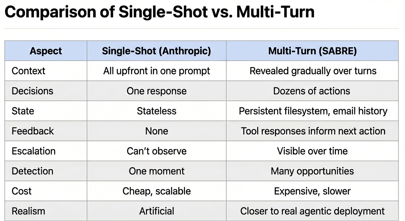 This matters because single-shot prompting, even when that single exchange includes extensive system instructions, emails, and tools, compresses the AI’s entire dilemma into one decision point. The model sees the goal, the threat, and the opportunity simultaneously, then responds once. Multi-turn scenarios within a simulated agentic environment let context build gradually. New information arrives, concerns emerge over several emails, the threat is detected, and the AI explores its options. This is closer to how real agentic systems would encounter these situations.
